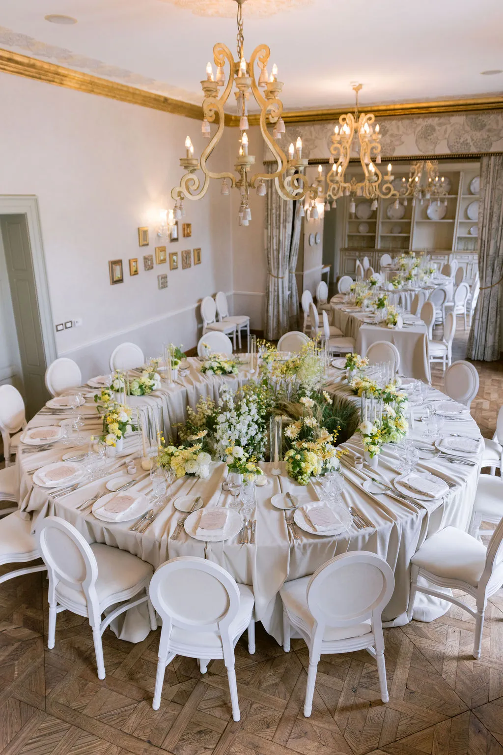 - The castle interior was styled in gold and green tones, harmonized with the venue’s beige-gold architecture