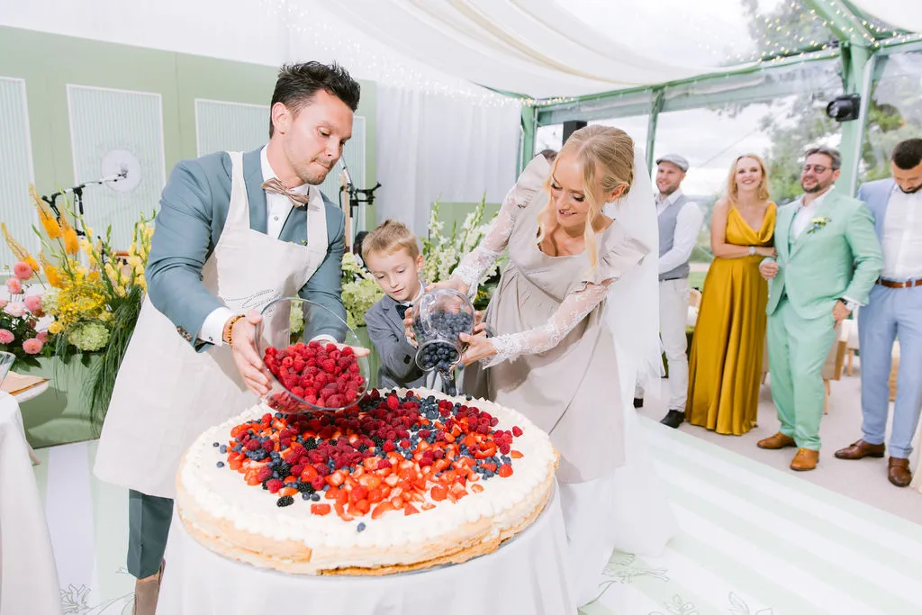 One of the most memorable moments was the wedding cake experience. Together with their pastry chef, the couple created their cake live in front of their guests. The atmosphere felt like a friendly competition finale — full of laughter, cheering, and shared excitement. The result was not only a beautiful cake, but a genuine experience.