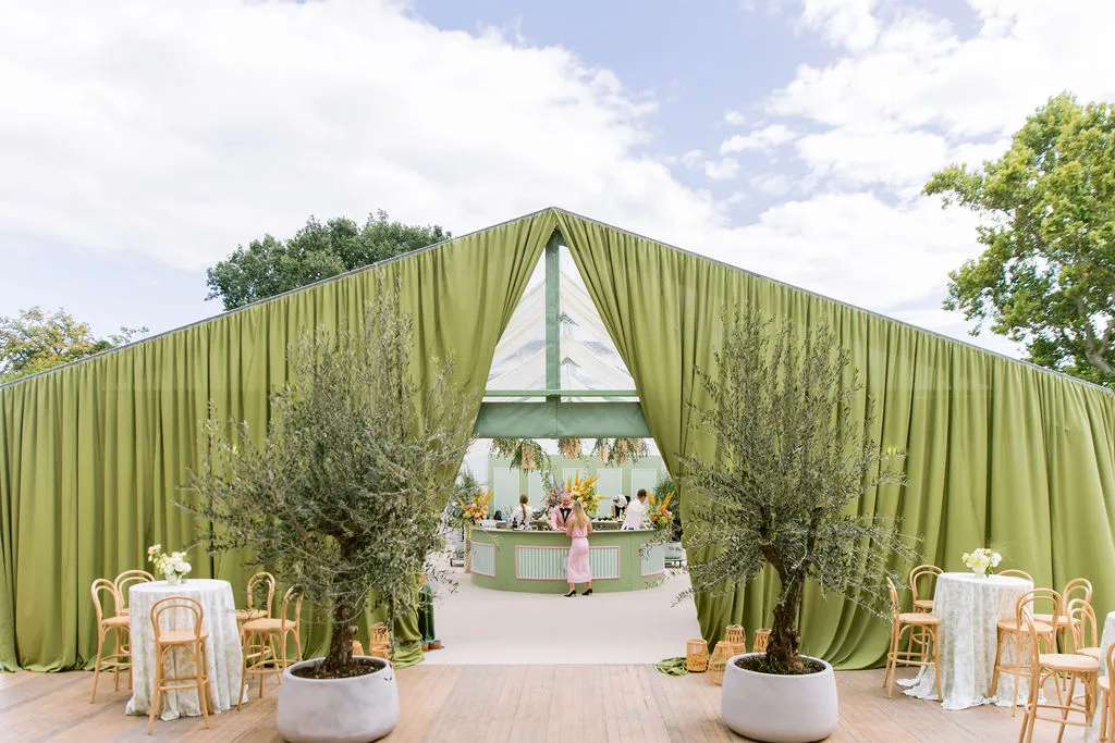 The evening continued around a custom cocktail bar with signature drinks, a dance floor, and live music. Scenic lighting unified the entire space, while fifty-year-old olive trees transformed the lounge into a small Tuscan-inspired world.