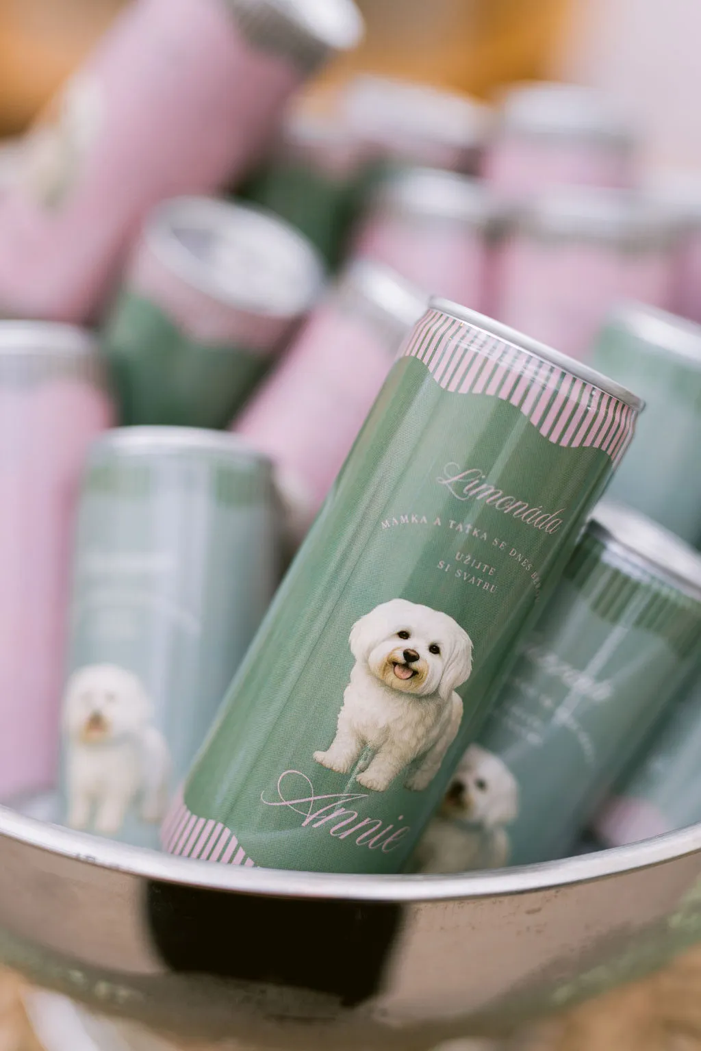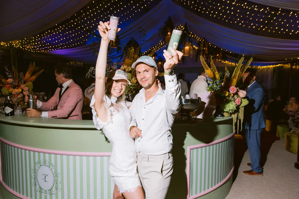 Lucie and Tomáš share a love for dogs, and this playful detail became part of the celebration. Custom wedding merchandise included caps with humorous slogans and personalized soda cans featuring their dog, Amie. The caps quickly became a favorite — worn, photographed, and enjoyed throughout the evening.