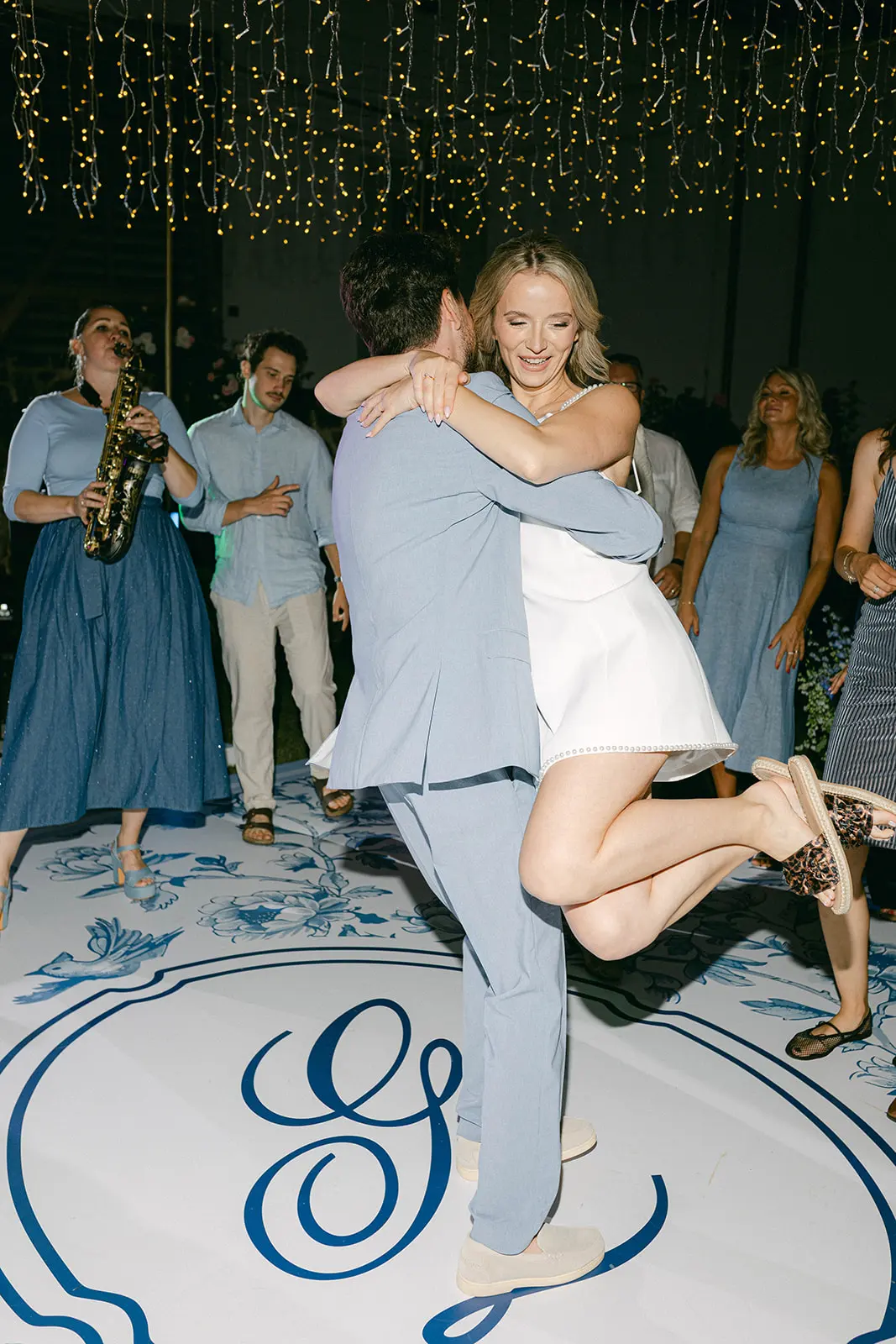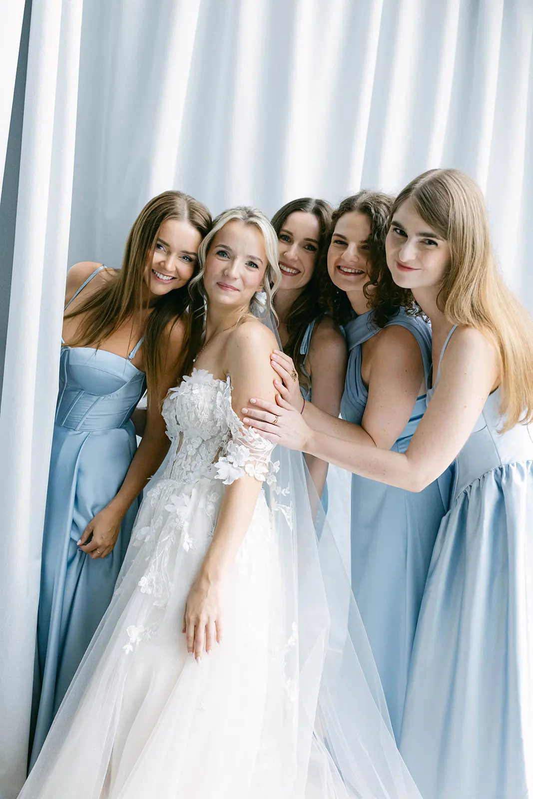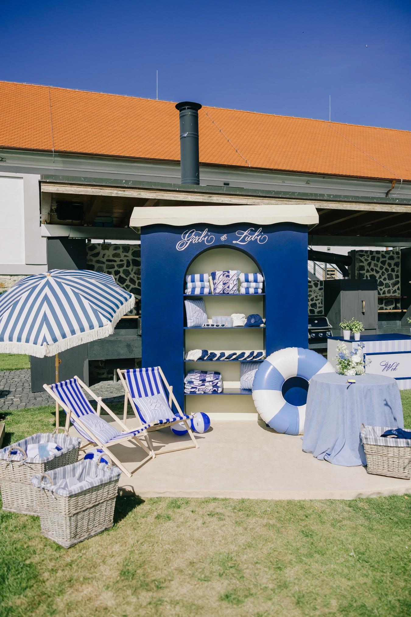 Dress code v jemných hamptons odstínech (bílá, písková, modrá) nastavil vizuální styl celé svatby a vytvořil pocit, že jsme se ocitli v letním resortu, ne na klasické svatební akci.