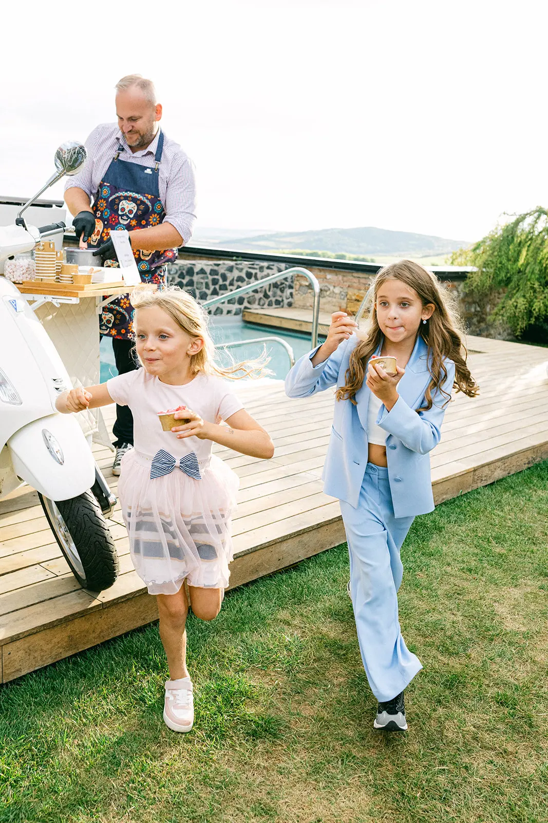 Třídenní svatby milujeme z jednoho prostého důvodu – nikdo nikam nespěchá. Svatební víkend proto odstartovala uvolněná BBQ welcome party u bazénu, kde se hosté postupně sjížděli, seznamovali a okamžitě se naladili na dovolenkovou vlnu.